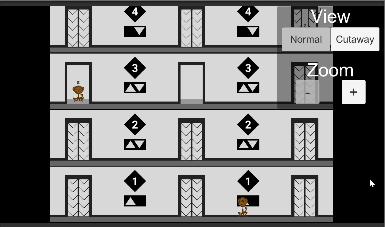 Created in response to an interview prompt. The criteria was to have a modular building design that contained an arbitrary number of elevators that go to random floors. I added monkeys as a rationale for elevator shenanigans.